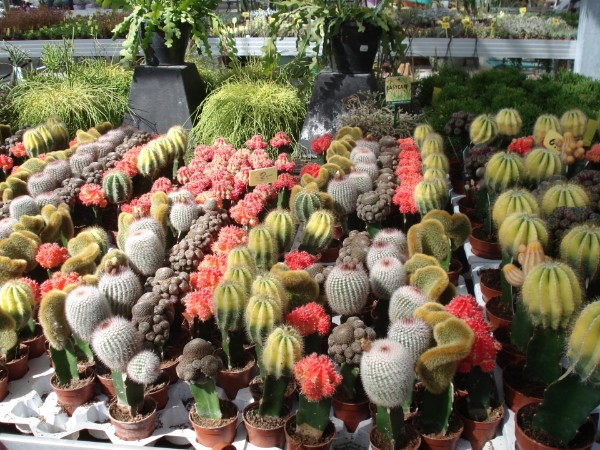 Bei schönstem Wetter fuhren wir zunächst über Karlsruhe zum "Kakteenland" bei Steinfeld in der Pfalz, welches zugleich deutsches Aloe Vera Zentrum ist. Dort konnten wir in lichtdurchfluteten Gewächshäusern sicherlich mehrere Hundert verschiedene eingetopfte Kakteen und andere Sukkulenten (saftspeichernde Wüstenpflanzen) bestaunen. Etliche davon waren interessant geformt und leuchteten farbintensiv. Weil die Pflanzen auch zum Verkauf auf den langen Tischreihen standen, gab es von jeder Art einige Dutzend Exemplare beieinander, was deren Farb- und Formenwirkung verstärkte. Laut Prospekt sollen so unter den Glasdächern "über eine Million exotische Pflanzen" zu bewundern sein.
