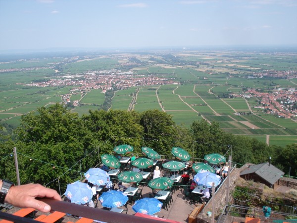 So fuhren wir bereits gut gestimmt nach Edenkoben zur Villa Ludwigshöhe und von dort aus mit dem Sessellift hinauf zur Ruine Rietburg. Hier konnte bei herrlicher Aussicht über die grünen Weinfelder und kleinen Ortschaften bis hin zum Rheintal Kaffee oder besser Kaltes getrunken werden. Denn mittlerweile zeigte das Thermometer über 30 Grad Celsius an.