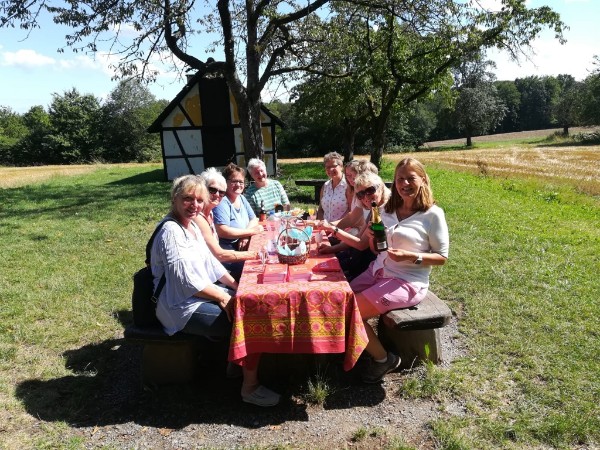 Gerne wurde hier im Schatten eine längere Pause eingelegt, zumal neben dem Tisch geschickt eine öffentliche Ruhebank stand. Nach einer weiteren halben Stunde erreichte man gegen 17.30 Uhr das Schützenhaus. Dort waren auch für weitere zehn Mitglieder, die in Autos gekommen waren, auf der Terrasse neben den Schießbahnen drei Tische reserviert, an denen man es sich einige Stunden bis zum Einbruch der Dunkelheit und merklicher Kühle a la carte gut gehen lassen konnte.