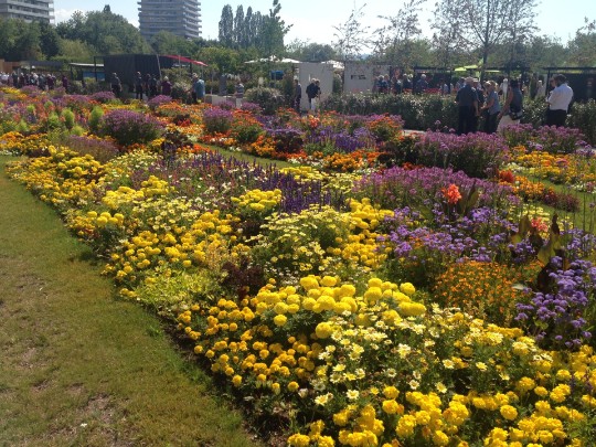 Da wir etwa sechs Stunden bis zur Rückfahrt Zeit hatten, sind sicherlich alle auch von hier über eine lang geschwungene Pylonfußgängerbrücke in den dritten Gartenteil "Seepark" gelaufen. In diesem größten Areal lag zentral ein großflächiger See mit Terrassenrestaurant, Sandstrand, Ufergarten, Schilfgebiet und Seepromenade. Ansonsten lagen verstreut oder in Reihen Ausstellungsflächen zu Themen wie Ortenaukreis, Grohe - Pure Freude am Wasser, Klein- und Obstbrenner, Fischereiverband, Imker, Auenwäldchen und verloren weit am Rand eine große Streuobstwiese.