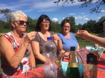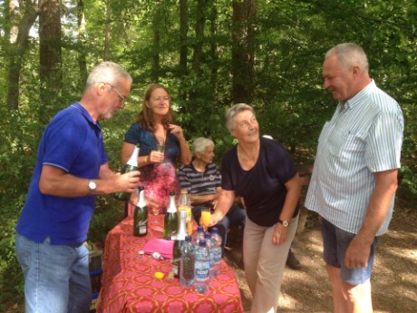 Um 16 Uhr fanden sich am Samstagnachmittag bei bestem Wetter und 24 Grad im Schatten dreizehn Mitglieder am Bogentor (Zugang zum Naturschutzgebiet SCHÖNBUCH Richtung Hohenentringen) ein, um gemeinsam zum Hagellocher Schützenhaus zu laufen. Nach einer halben Stunde - kaum hatte man das Heuberger Tor hinter sich gelassen - empfing die 2. Vorsitzende Silke die Wanderer am Wegesrand an einem mit Sekt, Orangensaft und Sprudel gedeckten Tisch.